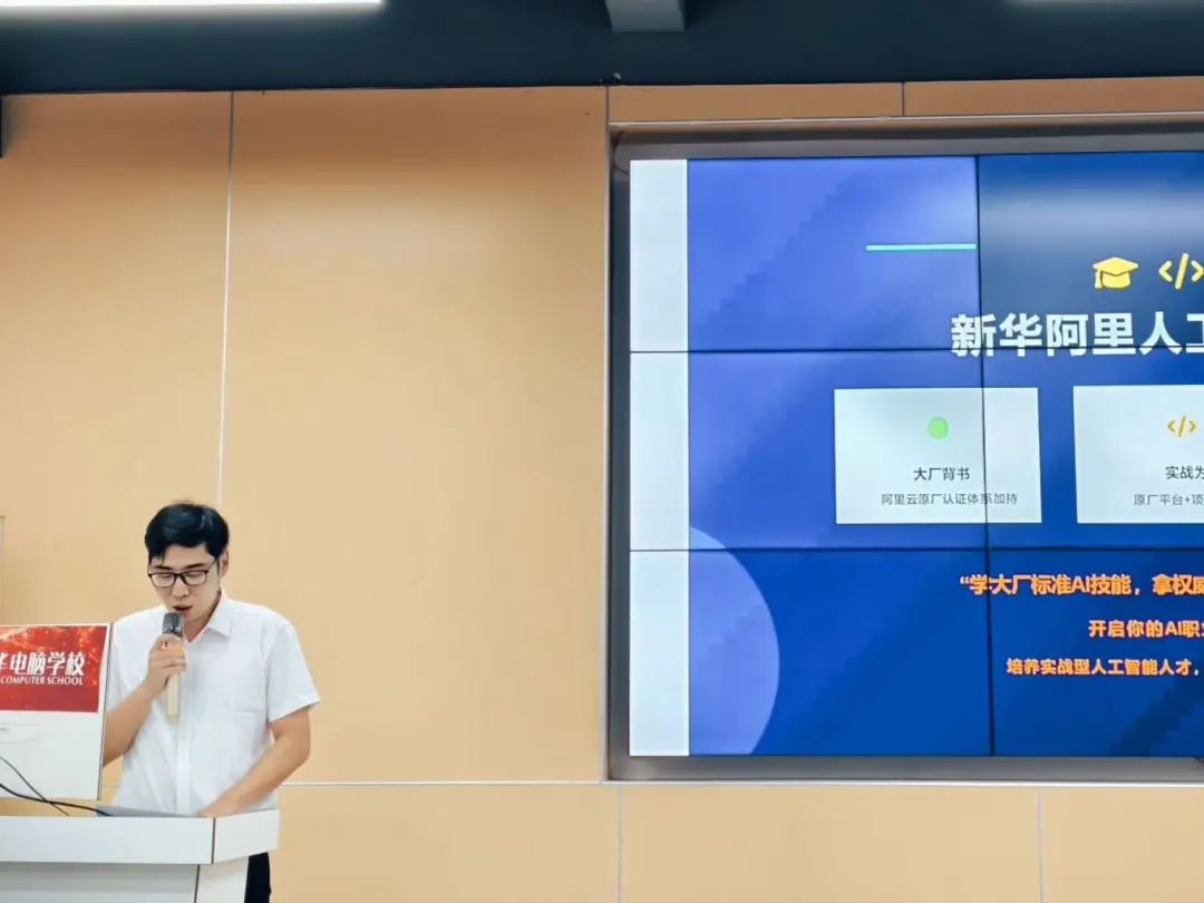 紧随其后,学校学科带头人谭聪介绍了新华阿里人工智能班的培养方向与课程设计重点。当前,人工智能产业快速发展,人才需求呈现爆发式增长。为积极响应国 家数字经济发展战略,学校主动对接产业升级需求,与阿里等头部企业深度合作,共同打造人工智能人才培养新高地。